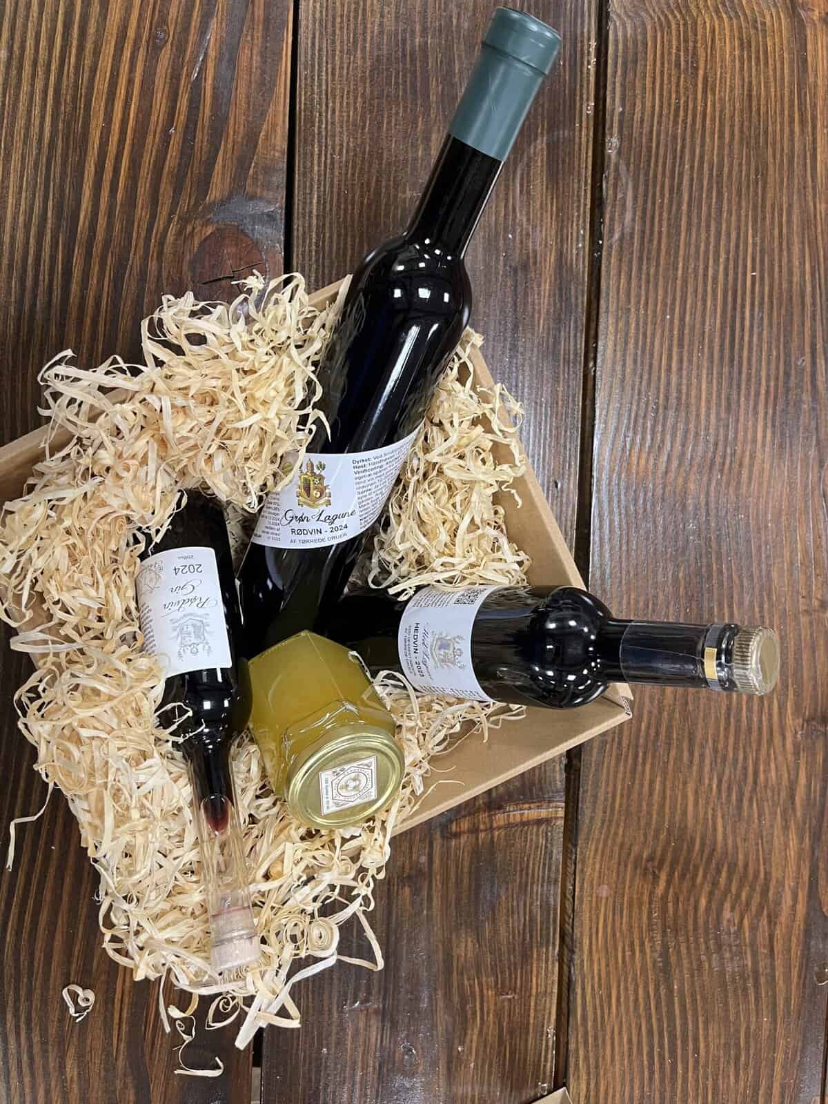 - Gavekurv, pakket i cellofan, med 1 fl rødvin Grøn Lagune 500ml, 1 fl 375 Hed Lagune ( portvin) , 1 fl Rødvin Gin, 200ml, 1 glas af gårdens egen honning 200ml