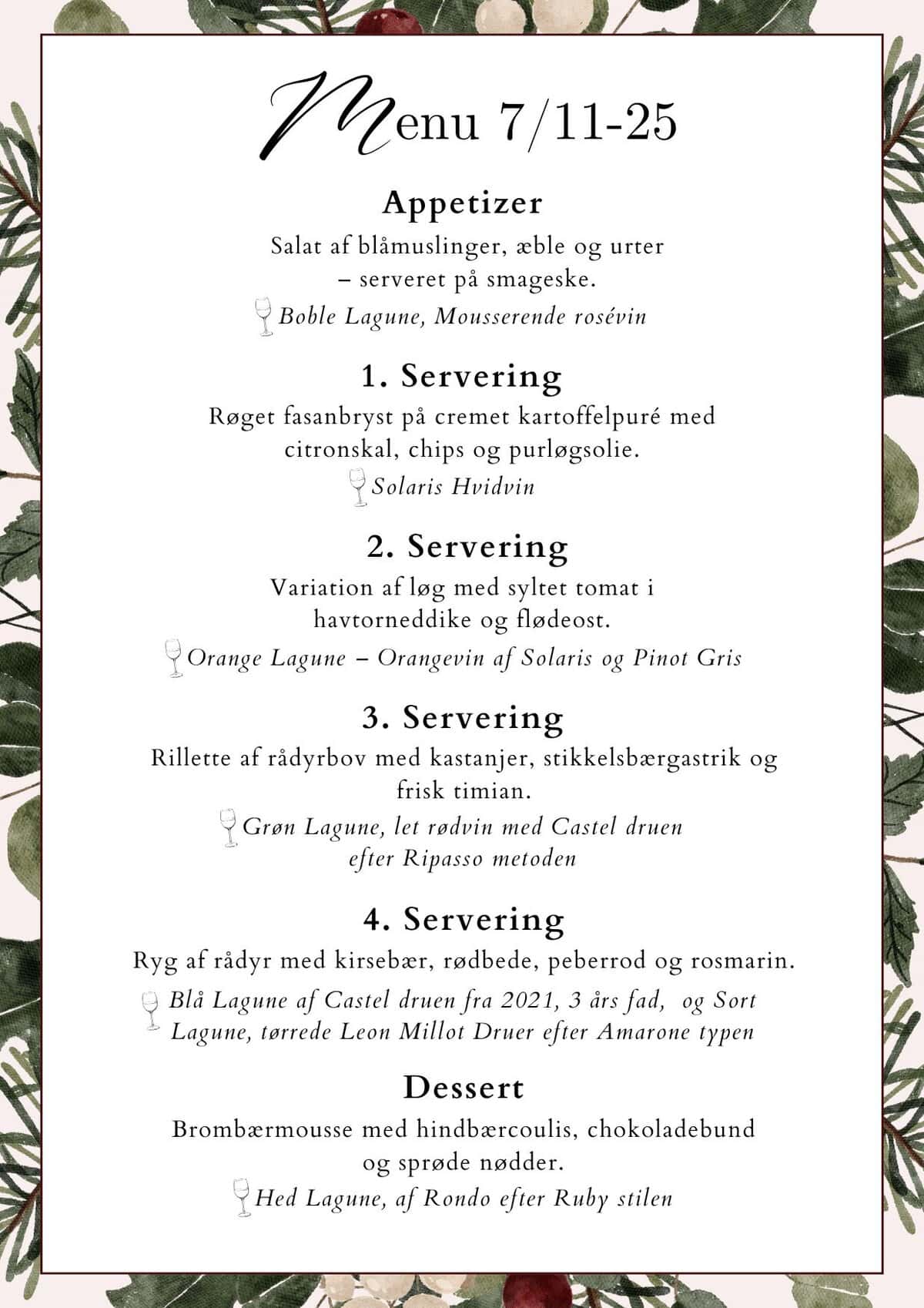 Glæd dig til en aften i vores hyggelige omgivelser, hvor dansk vin og mad forenes i en harmonisk symfoni. Vores prisvindende vine og eksklusive retter skaber en uforglemmelig oplevelse.